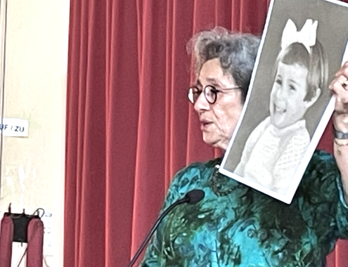 (mo.) Zum wiederholten Mal war die Zeitzeugin Rozette Kats zu Gast in der Aula der Goetheschule. In anschaulicher Weise erzählte sie dem 10. und 11. Jahrgang ihre berührende Lebensgeschichte, deren Leid den Folgen der Ermordung ihrer jüdischen Eltern in Auschwitz entspringt: Ihre kindliche Welt bricht zusammen, als ihr „Vater“ ihr mit 6 Jahren eröffnet, er sei nicht ihr Vater, genauso wenig wie seine Frau ihre Mutter sei. Aber man wolle nicht mehr darüber reden. - Das sieht Rozette Kats anders: Zum Glück!
