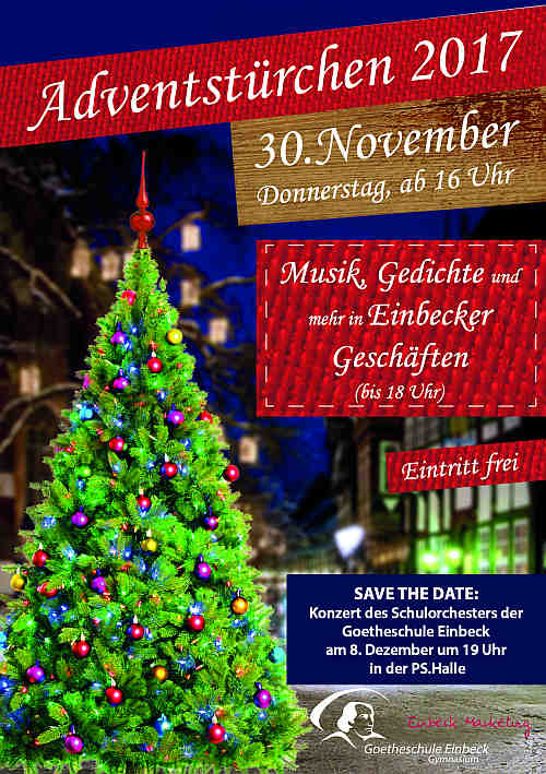 In 11 Geschäften können Besucher am 30. November von 16 bis 18 Uhr Musikalisches, Lyrisches, Wissenswertes rund um Weihnachten und X-mas Zumba zum Mitmachen erleben. Das Programm gestalten Schülerinnen und Schüler aller Jahrgangsstufen der Goetheschule, wobei das Publikum eine große Vielfalt erwartet: Sängerinnen und Sänger, Instrumentalisten, Tänzerinnen sowie eine Band laden an diesem Freitagabend zum Schlendern durch die Stadt, zum Eintauchen in die besondere Weihnachtsatmosphäre des „Adventstürchens“ und zum Verweilen in den Geschäften ein. Dies kann man individuell oder wie im letzten Jahr gemeinsam in geführten Gruppen erleben. Schülerinnen und Schüler der Schülerfirma „Goethe Promotions“, die diese Aktion in Kooperation mit Einbeck Marketing organisiert, erwarten die an den Führungen interessierten Gäste um 16 Uhr an der Weihnachtsbühne auf dem Marktplatz. Von dort aus gehen sie gemeinsam zu den einzelnen Veranstaltungsorten.