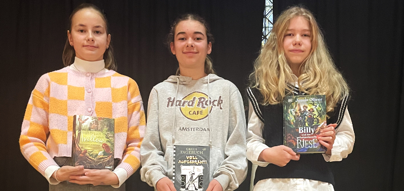 (mo.) In einem spannenden Finale wurde im Schulentscheid des Vorlesewettbewerbs des Deutschen Buchhandels die diesjährige Siegerin der Goetheschule ermittelt: Es ist Marlene Drescher aus der 6b. Mit einer beeindruckenden Leseleistung aus Jamie Olivers „Billy und der geheimnisvolle Riese“ überzeugte sie die Jury. Die Parallelklassen der sechsten Jahrgangsstufe hatten mit Hanna Amberg aus der 6a und Hanna Cohrs aus der 6c starke Kandidatinnen entsandt, gegen die sich Marlene durchsetzen konnte. Als Dank für ihre Teilnahme erhielten die Finalistinnen je ein Buchgeschenk; die Siegerin erhielt einen Büchergutschein.